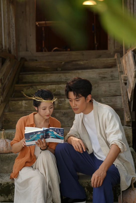 主演屈梦汝(饰演西苏)、华文辰(饰演枕水)在片场阅读原著小说《从贵州到罗瓦涅米》
