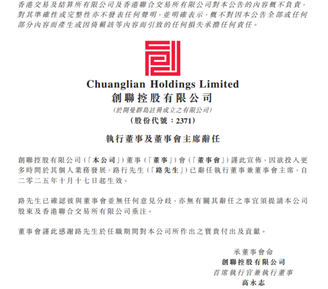 面对这一丑闻,路行选择了辞任创联控股有限公司的执行董事兼董事会主席。10月17日,创联控股发布公告称,路行因欲投入更多时间于其个人业务发展,已辞任相关职务,辞任自当日起生效。