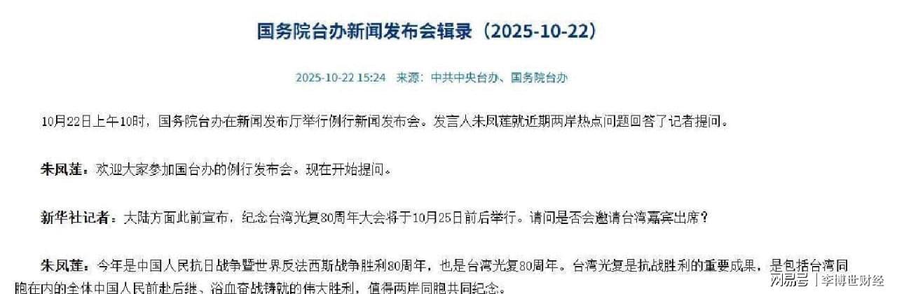 据悉,人民大会堂已正式发出邀请函,纪念活动定于2025年10月25日举行。这一日期不仅标志着台湾光复80周年,也恰逢世界反法西斯暨中国人民抗日战争胜利80周年,双重历史节点让此次纪念活动的意义更加深远。