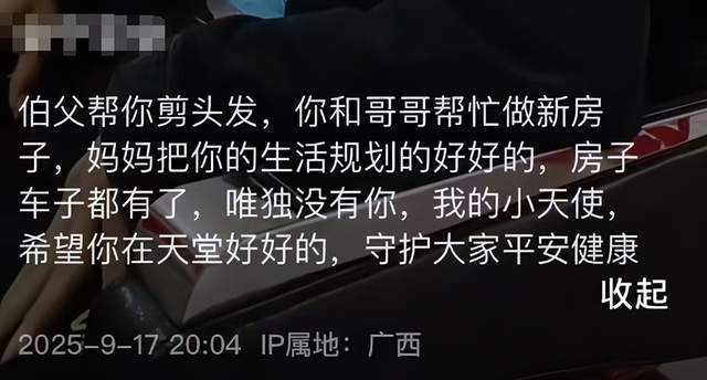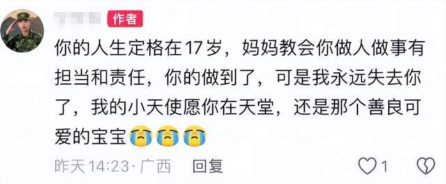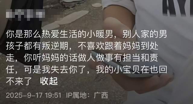 9月17日,一位网友在网上发帖悼念自己的儿子,这位母亲悲痛地写道:“你的人生才刚刚开始,是妈妈大意了,对不起我的儿子,永远失去你了。”字里行间,透露出无尽的悔恨与哀伤。