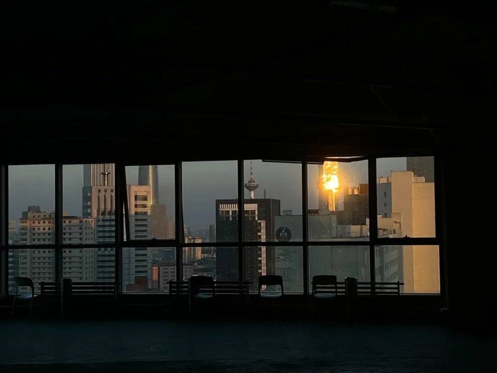 今日夕阳西下时,我正要往回走,转头看到窗外的城市闪着一点夕阳余晖。余晖经过反射,照到了这个空间里。