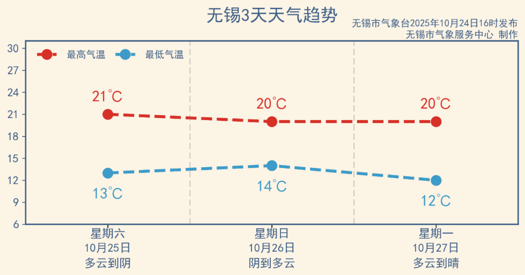 今年秋冬的“换季大戏”仍在持续上演,新一股冷空气已经蓄势待发。预计10月25到26日,无锡市将以云系变化为主,最高气温维持在20℃左右。然而,受弱冷空气南下的影响,28日、29日早晨的最低气温将降至11℃左右。