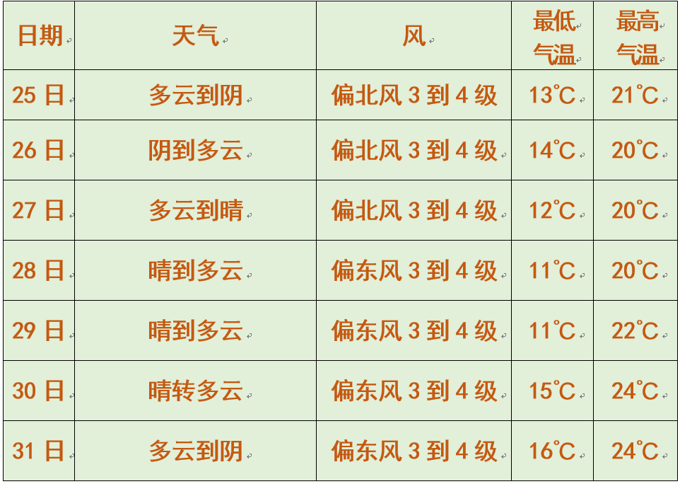 本省东南部地区将呈现多云到阴有时有小雨的天气,其他地区则以多云为主。全省偏北风转偏东风,风力都是4级左右。