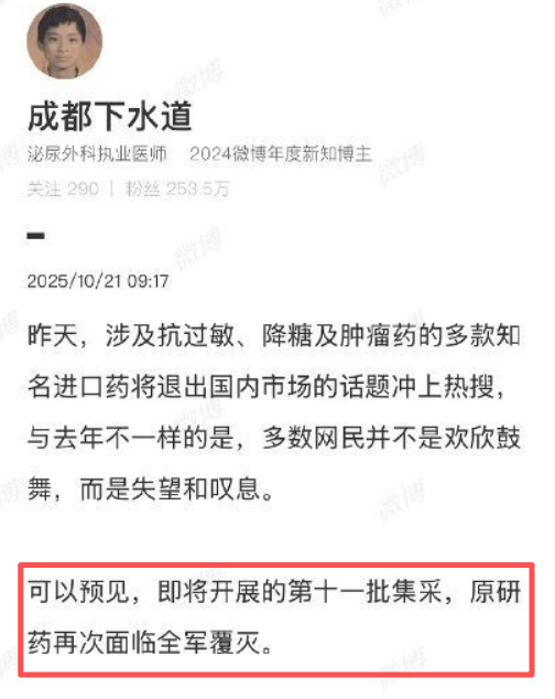有医疗领域博主直言:“可以预见,即将开展的第十一批集采,原研药再次面临全军覆灭。”这一观点揭示了进口药退出的核心矛盾——在药品集中采购政策下,原研药因价格优势不足,逐渐被国产仿制药替代。