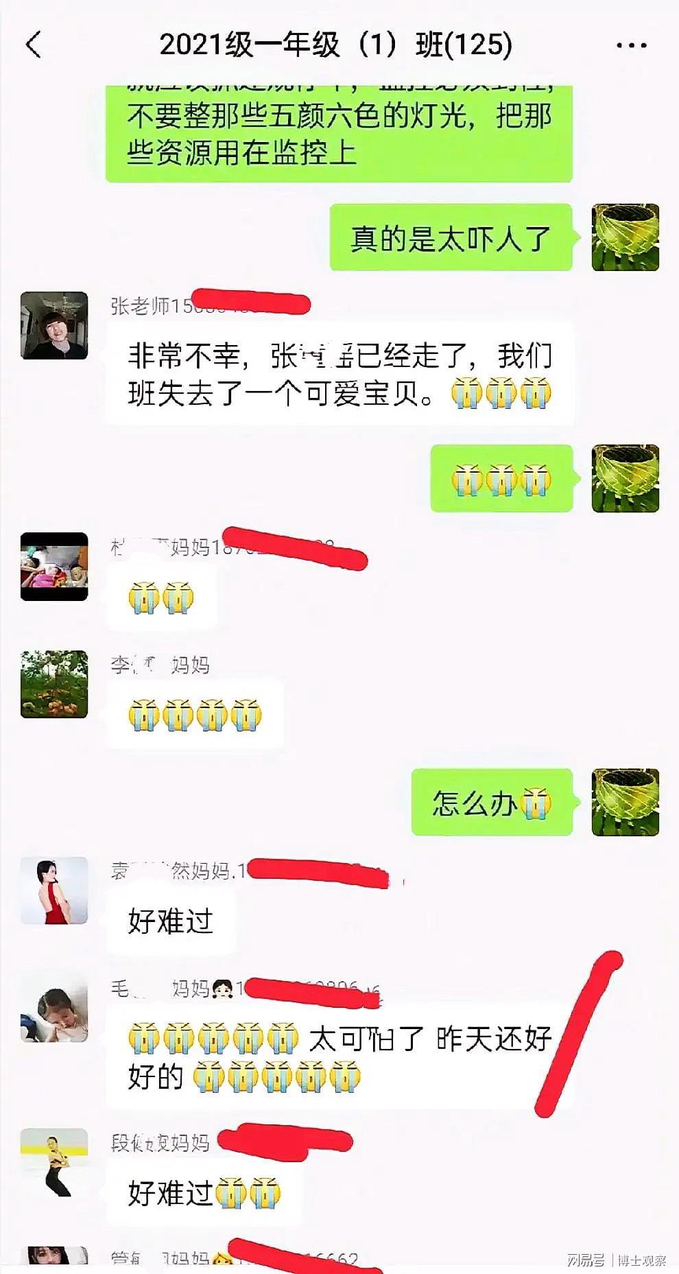另外,网络上曝光了一张疑似重庆路小学某班级家长聊天群的截图。内容显示该班级有一名学生在此次事故中不幸丧生,群内众多家长留言表达悼念之情。