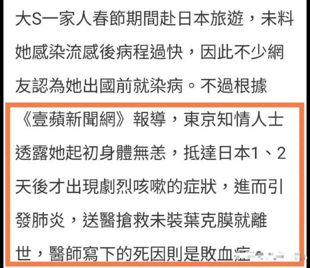 后来据媒体所说,大S真正的病因是败血症。