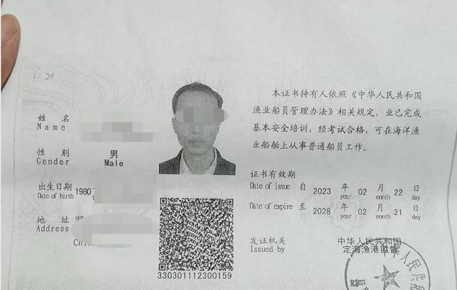 ▲王某在2023年取得的渔业船员证复印件 受访者供图