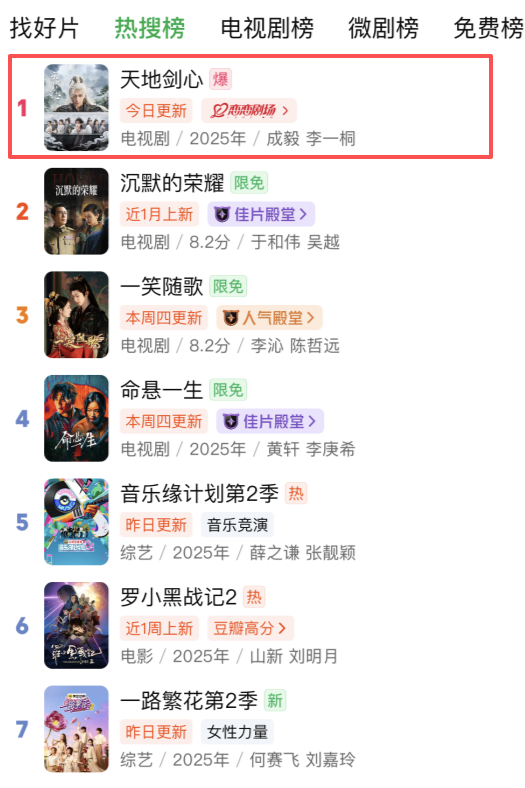 《天地剑心》上线桃厂后,仅2小时便拿下站内热榜第一,热度轻松突破6500,成绩斐然。与此同时,豆瓣口碑新鲜出炉,观众好评如潮,纷纷称赞其“剧情紧凑”“特效震撼”“情感线治愈”,成为十月国剧市场又一部值得熬夜追的古装玄幻大剧。