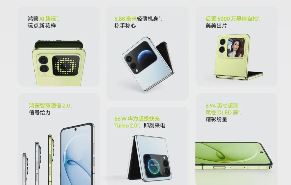 华为nova Flip S小折叠手机以3488元起的价格亮相,自带“潮流女王”的气质。该机提供12GB + 256GB、12GB + 512GB、12GB + 1TB三种存储规格,以及羽砂黑、天青蓝、零度白、星耀黑、向新绿、樱语粉六种配色,满足消费者对美的追求。内置4400mAh电池,支持66W有线快充,玄武水滴铰链系统获得了瑞士SGS 120万次弯折耐久认证,折叠起来小巧精致,展开来功能强大。后置5000万像素+800万像素双摄,拍照效果出色。内屏为6.94英寸OLED屏,2690*1136分辨率,支持1-120Hz LTPO自适应刷新率和1440Hz高频PWM调光;外屏为2.14英寸1:1方形,分辨率480*480,支持可爱萌宠、通话趣显、DIY壁纸等超有趣的功能,视觉效果超棒。
