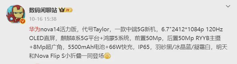 华为nova 14活力版以2199元起的价格,成为了一款中端5G新机。该机代号Taylor,搭载麒麟8系5G平台加上鸿蒙5系统,性能稳定。6.7英寸的2412×1084p 120Hz OLED直屏,提供羽砂黑、冰晶蓝、凝霜白这几种配色,颜值在线。5500mAh的大电池配上66W快充,续航无忧。还有IP65防尘防水功能,后置50Mp RYYB主摄+8Mp超广角,前置50Mp,拍照效果同样出色。