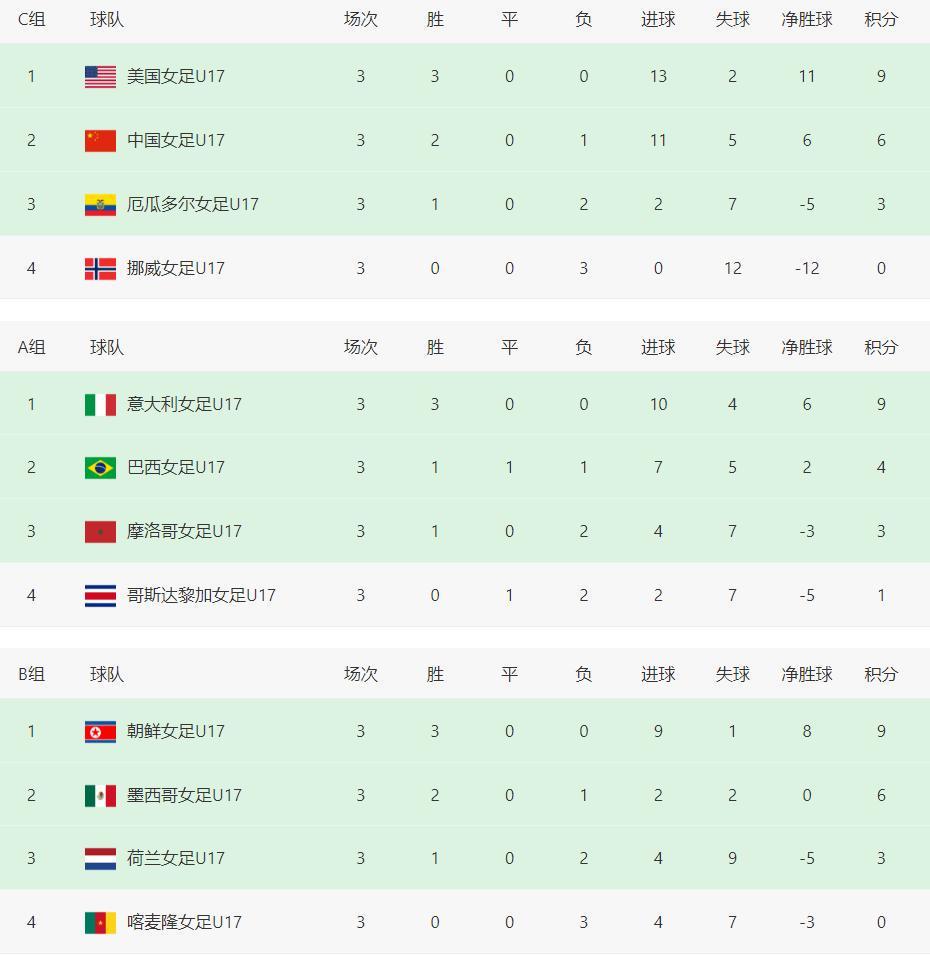 在A组末轮激战正酣的同时,C组的两场比赛也已提前结束。中国女足以4-0的绝对优势大胜厄瓜多尔队,而美国队则以5-0的悬殊比分狂胜挪威队。这样一来,美国队锁定C组第一,中国女足紧随其后拿到第二,两队携手晋级16强;厄瓜多尔队获得第三,其晋级命运仍待后续比赛揭晓;挪威队则位列垫底,确定无缘下一阶段。