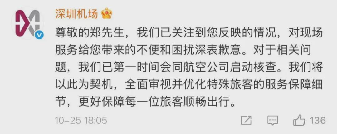 针对郑智化的吐槽,深圳机场官方微博在今日傍晚迅速做出了回应。他们在郑智化的微博文章下留言表示:“尊敬的郑先生,我们已关注到您反映的情况,对现场服务给您带来的不便和困扰深表歉意。对于相关问题,我们已第一时间会同航空公司启动核查工作,并将以此为契机,全面审视并优化特殊旅客的服务保障细节,以更好保障每一位旅客的顺畅出行。”