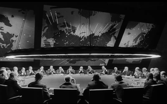 而且我认为同样有趣的是,那些电影在多大程度上实际上正在与核领域的工作人员产生对话。所以如果你注意到,在电影中的战略司令部里,大监视器下面写着「巨型作战地图板」,这直接取自《奇爱博士》。