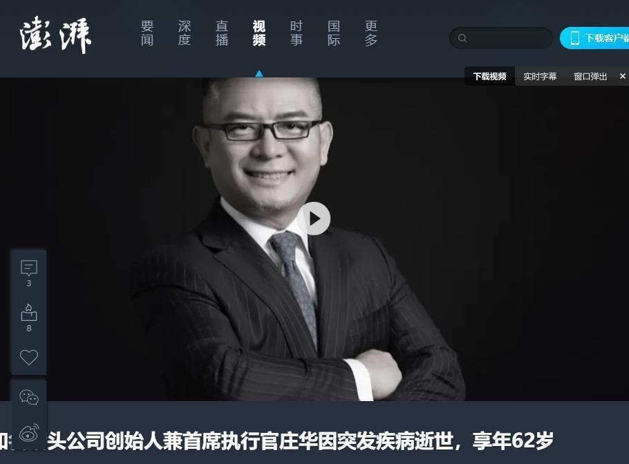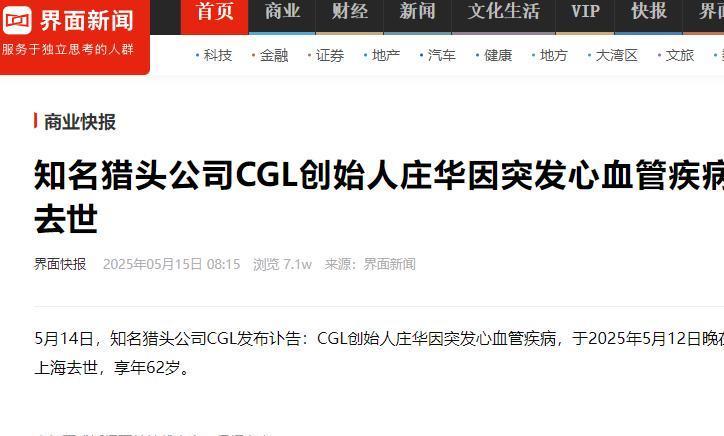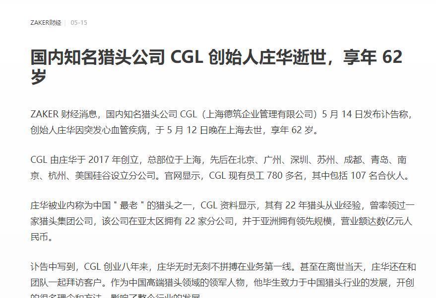 信息来源:知名猎头公司CGL创始人庄华因突发心血管疾病去世