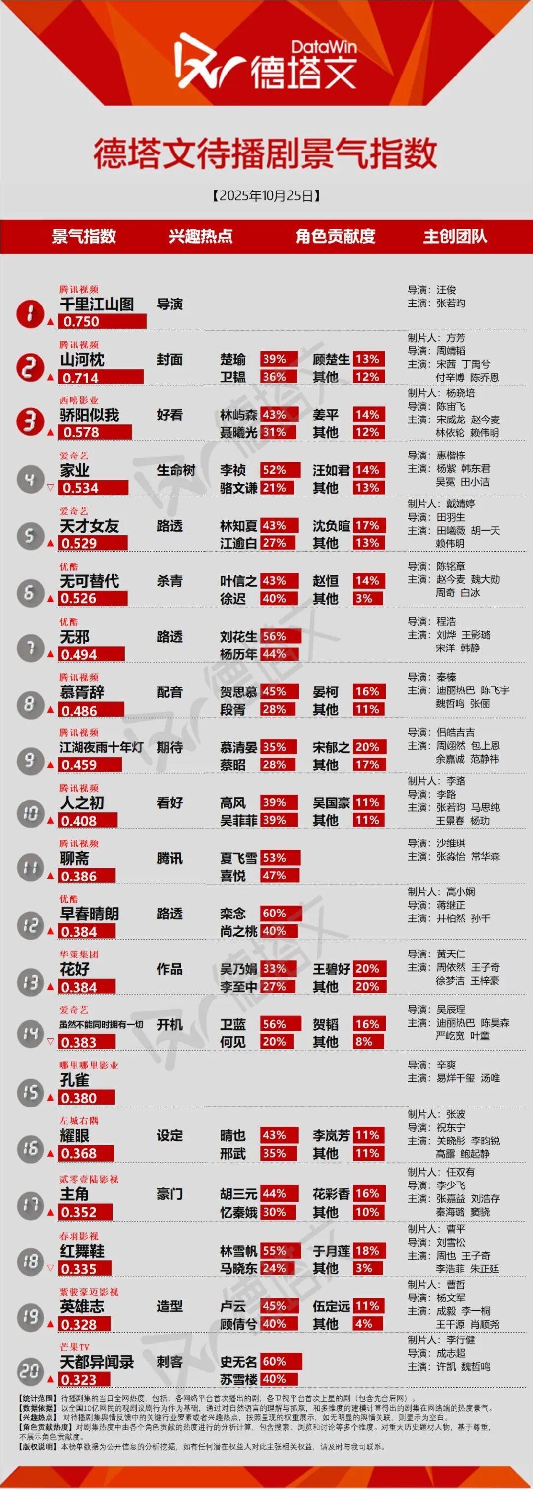 10月24日开机的新剧《虽然不能同时拥有一切》引发市场高度关注,带动剧集登上待播榜。该剧的市场高期待值主要源于其IP改编的扎实基础与主创阵容的顶级配置。该剧改编自日本直木奖作家山本文绪的《蓝,另一种蓝》,原著以“平行世界互换人生”探讨女性选择困境,积累了忠实粉丝,观众称其“剧情带感”。同时,剧集采用电影级配置,金像奖得主翁子光监制,导演吴辰珵曾执导《大世界扭蛋机》,搭配迪丽热巴、叶童等演员。其中,迪丽热巴一人分饰两角的设定引发热议,严屹宽、叶童、朱茵等资深演员的“戏骨加持”,为剧集品相提供了一定保障。