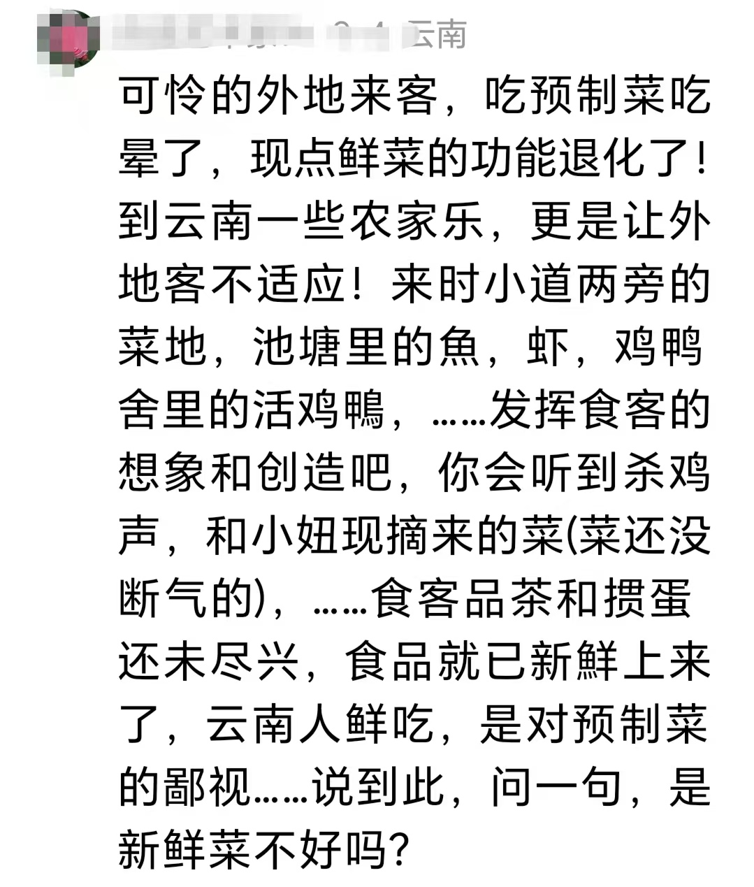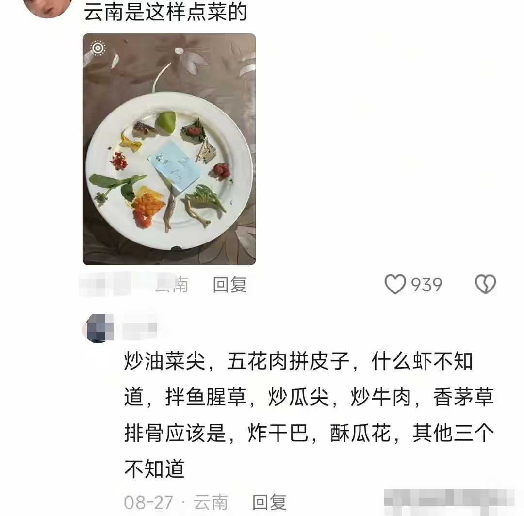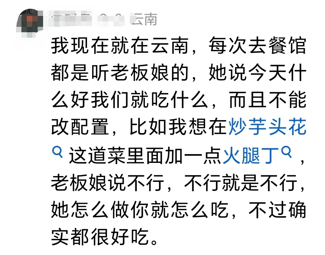 有位东北大哥就曾在视频中吐槽自己的经历:“坐了十分钟,服务员连个菜单影都没见着。我问菜单呢,人家指了指柜台里的茄子辣椒,说‘这就是菜单’。我当时就懵了,这是让我看图说话啊?”对于这样的点菜方式,云南网友则显得颇为得意:“这才叫新鲜!你要是说‘随便整点’,老板能给你整出四菜一汤,比你自己点的还合胃口。”