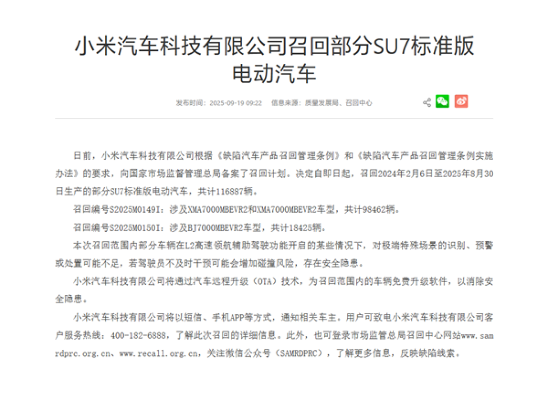 针对这起事故,小米与雷军虽然都有积极正面的表态,但始终没有对事故的真相做进一步的说明。直到9月份小米汽车大规模召回了11多万辆小米SU7,并在召回原因中提到了智能辅助驾驶技术在某些特殊复杂路段存在安全隐患,才让人重新回想起那起交通事故。