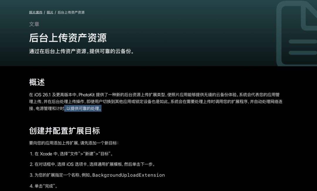 这一局面即将迎来改变。根据苹果开发者文档披露,iOS 26.1系统通过PhotoKit接口新增了「后台云备份」功能,首次允许第三方照片/网盘应用实现自动化备份。这意味着谷歌照片、OneDrive等应用可在后台静默运行,无需用户手动操作即可完成数据迁移。