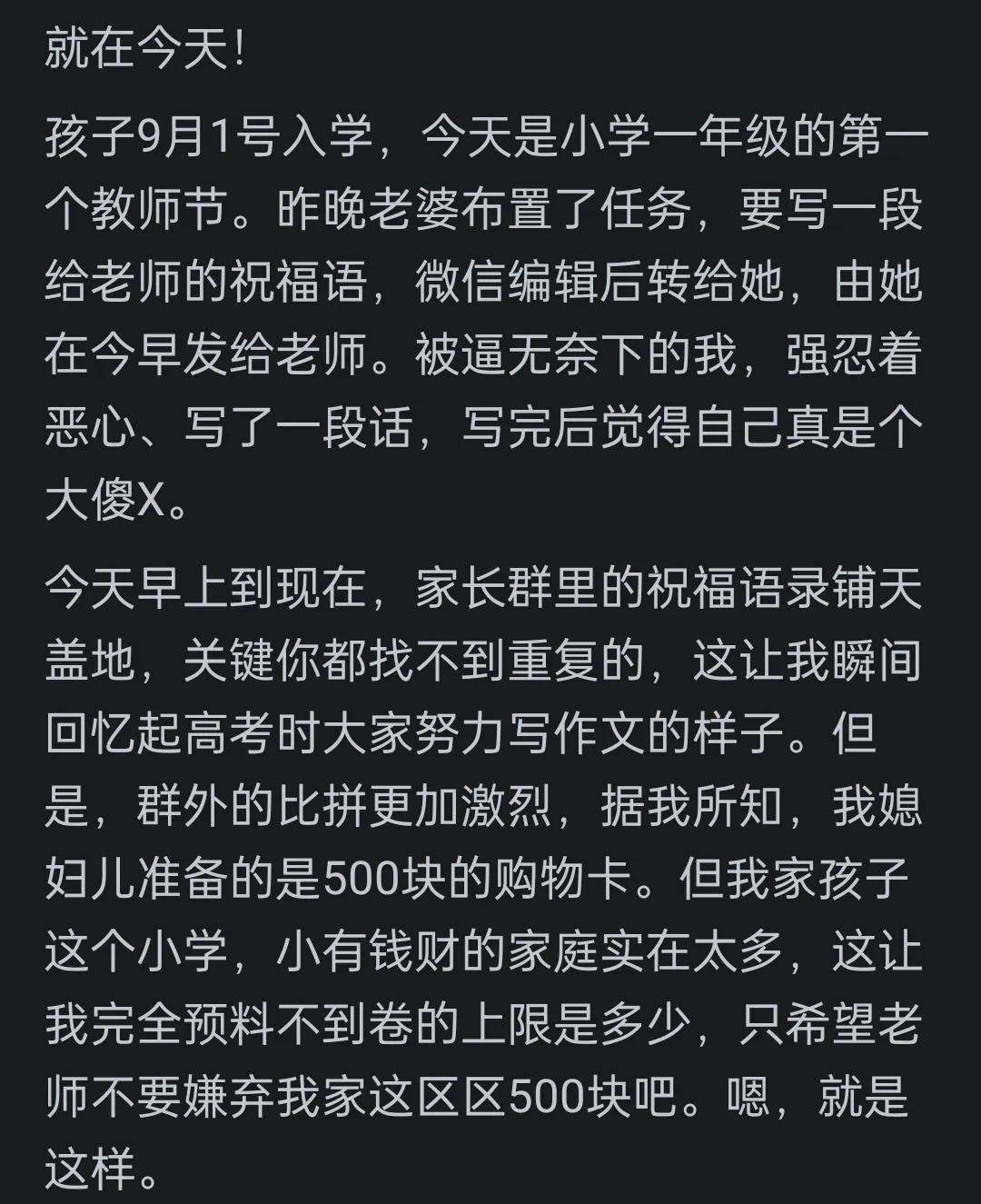 刚刚,就在我刷到你这条时,微信窗口弹出了幼儿园群里老师的通知,说三点半学校有针对家长的讲座,让每个家长都尽量支持下,如果爸爸妈妈实在请不了假,就爷爷奶奶去一个也行。两点半发的通知啊!让一个小时后到校参加。这是默认所有家长都是闲着没事随时等待调配的