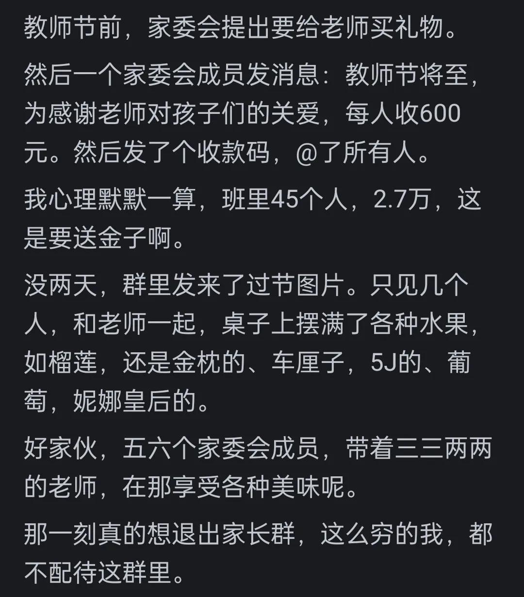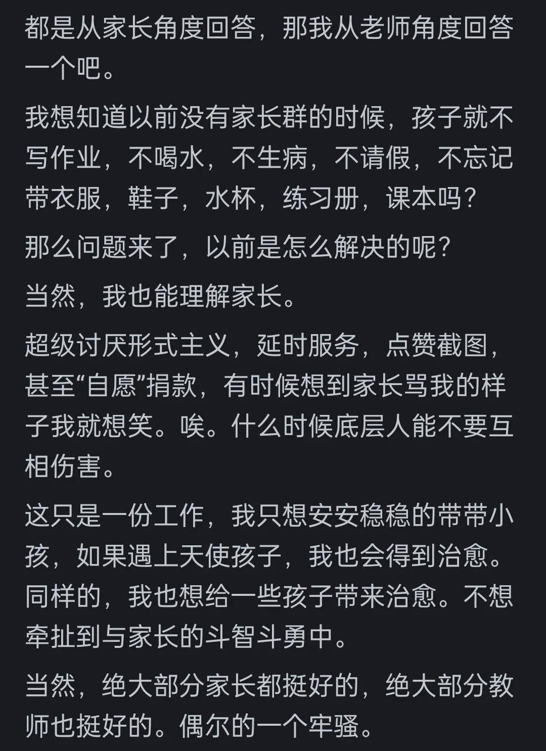 说实在的我是老师,我也想退群,每天群里让发的东西,都是上级领导让发的,我们只是执行者家长嫌我们烦,领导嫌我们慢。有些家长一天到晚群里@老师,我们是初三,提醒孩子吃药,提醒孩子喝水,提醒孩子她奶奶接,去到哪里哪里等待……突然好喜欢上课45分钟,单纯的教书育人