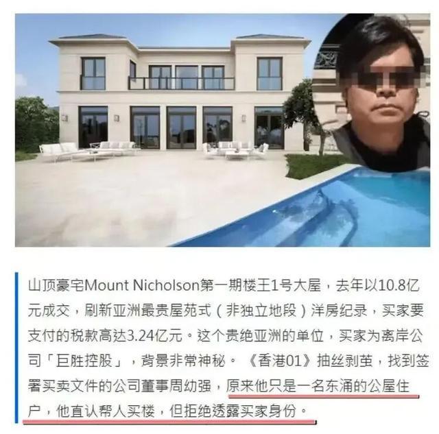 故事始于2016年香港楼市的一场震动。当年12月,山顶超级豪宅Mount Nicholson的一号屋王以10.8亿港元成交,仅税款就高达3.24亿,刷新了亚洲最贵洋房的纪录。然而,买家登记的是一家名为“巨胜控股”的离岸公司,签字者却是住在东涌公屋的中年男子周幼强。这一矛盾的组合引发了无数猜测,直到八年后真相才大白于天下——这栋豪宅的真正主人正是陈志。