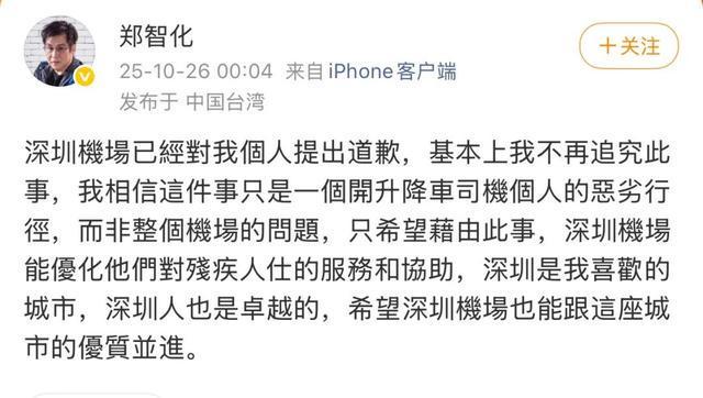 26日凌晨,郑智化在微博更新回应:“希望借由此事,深圳机场能优化对残疾人士的服务和协助。深圳是我喜欢的城市,深圳人也是卓越的,希望深圳机场也能与这座城市共同进步。”