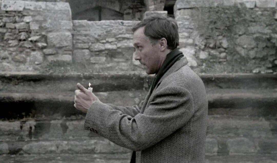 在1983年接受戛纳电影节记者的专访时,塔可夫斯基又进一步明确了自己的观点。他对那些热衷快乐的人感到厌烦,认为只有纯洁的灵魂——像孩子或者老人——才有资格快乐。对他而言,快乐就意味着对自身的境遇一无所知。提到情感与精神的差别,他又引用黑塞的见解,认为情感是人与物质世界的相遇,它和灵魂的本质毫无关系。这番言论,不由得令人想起《乡愁》里的一个细节:主角戈尔恰科夫尝试双手托着烛火,从泳池的一端走到另一端。“烛火”象征着脆弱却不灭的精神信仰,当这个行为一遍遍被重复,主人公个人的思乡之情早已不再重要,重要的是“人类共同的乡愁”这一精神思考——情感成了精神仪式的陪衬。