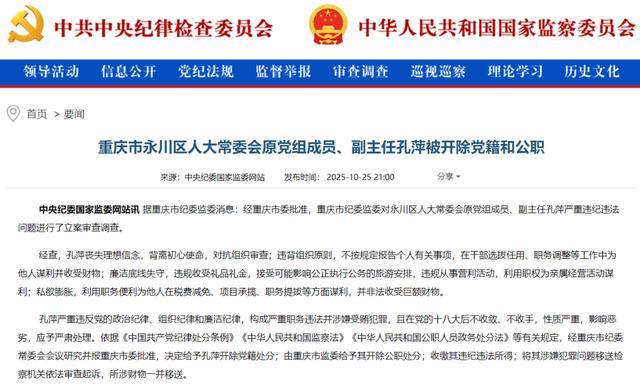 10月25日,中央纪委国家监委网站发布通报:经重庆市委批准,重庆市纪委监委对永川区人大常委会原党组成员、副主任孔萍严重违纪违法问题进行了立案审查调查。