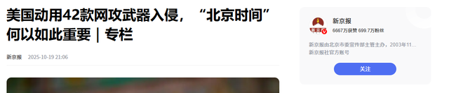 信息来源:美国动用42款网攻武器入侵,“北京时间”何以如此重要|专栏 新京报2025-10-19 21:06