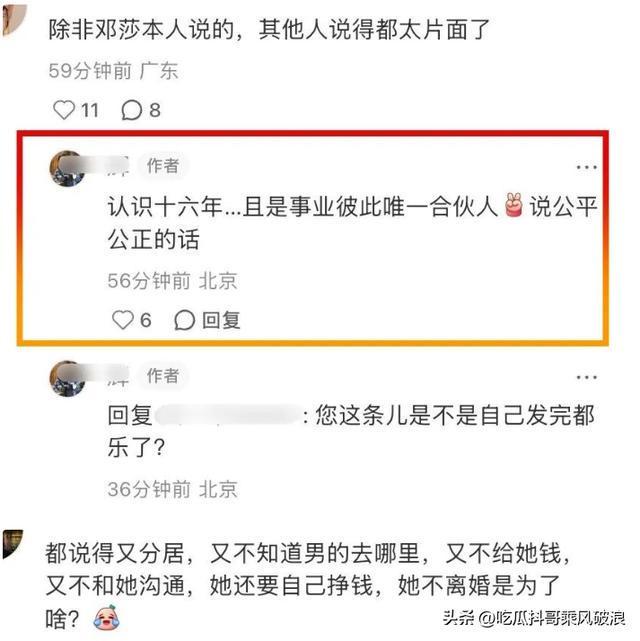 邓莎的合伙人透露,邓莎自从嫁给路行后,就几乎没有花过路行的钱。路行给邓莎的钱,基本上都是给儿子的教育费用和生活费用,且都是专款专用。这位合伙人认为,邓莎嫁给路行是出于爱情,邓莎从少女时代就是恋爱脑,一直到现在,她为了孩子都不曾有过放弃婚姻的想法。