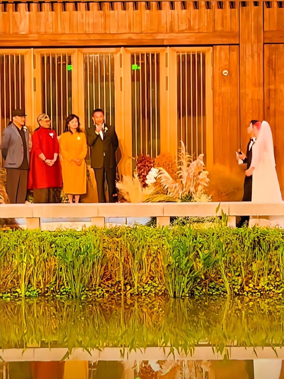 相比新娘的华丽换装,新郎全程身着合身西装,虽造型简约却难掩帅气。两人身高相仿,新郎的乖巧形象与刘一丝的明艳形成互补。网友推测新郎为重庆本地人,其父母也现身婚礼:父亲穿白衬衫黑西装,颜值颇高;母亲则以金黄色礼服吸睛,尽显贵气。