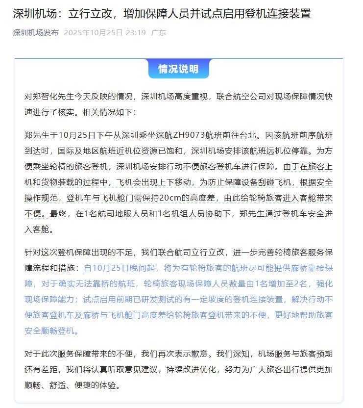 面对舆论压力,深圳机场反应迅速,第一时间在郑智化账号下留言道歉,并表示已启动核查。当晚,机场发布情况说明,解释20公分高度差符合安全规范,升降车司机按操作流程执行,并强调郑智化在一名地服人员和一名机组人员协助下,通过登机车安全进入客舱。机场承认服务存在不足,承诺联合航司整改。