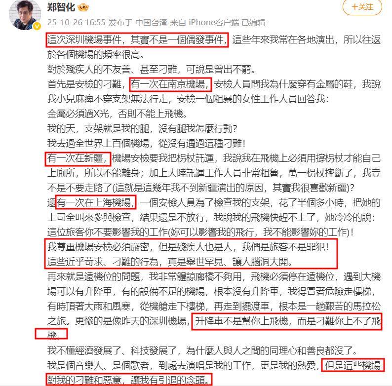 长文中,郑智化列举多地机场经历:在南京机场,安检人员要求他脱下金属支架鞋过X光,否则禁止登机;在新疆某机场,安检要求托运拐杖,导致他无法在飞机上自行如厕;在上海机场,支架被检查半个多小时仍不放行,女性安检人员冷冷回应“请不要影响我的工作”。他强调尊重安检必要性,但残疾人应得到基本尊重,而非被当作“罪犯”对待。最后,他再次提及深圳机场,称升降车“刁难人上不了飞机”,并表示这些经历让他产生退圈念头。
