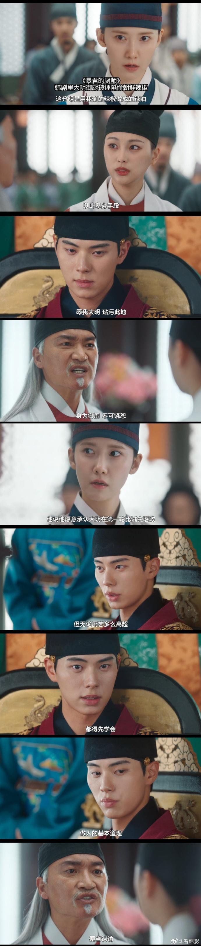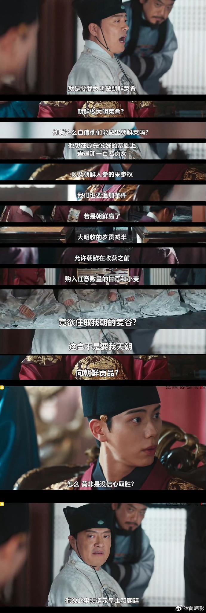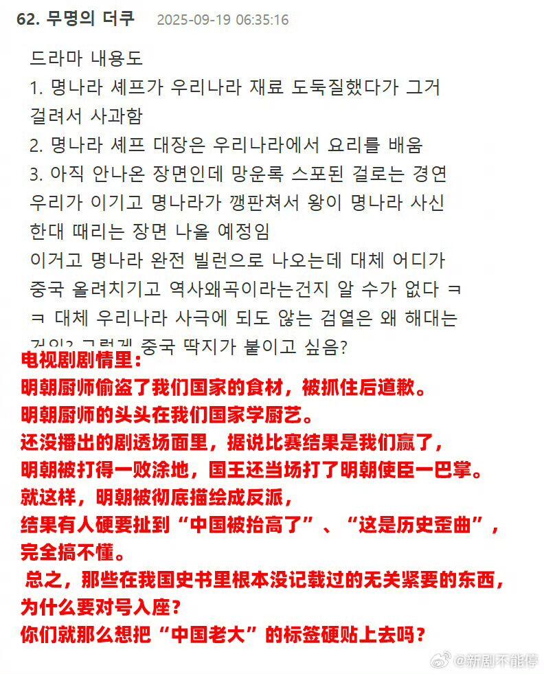 该剧的剧情可谓离谱至极。比如,“大明厨师去朝鲜学厨艺”、“大明川菜大师在朝鲜才第一次见到辣椒”、“川菜败给拌饭”等情节,完全是对历史的歪曲和意淫。更离谱的是,剧中还有朝鲜厨师打脸大明使者的剧情。要知道,在韩国自己的史书上,都记载着明朝时期朝鲜是如何俯首称臣的。该剧如此拍摄,无疑是在否认自己的史书。
