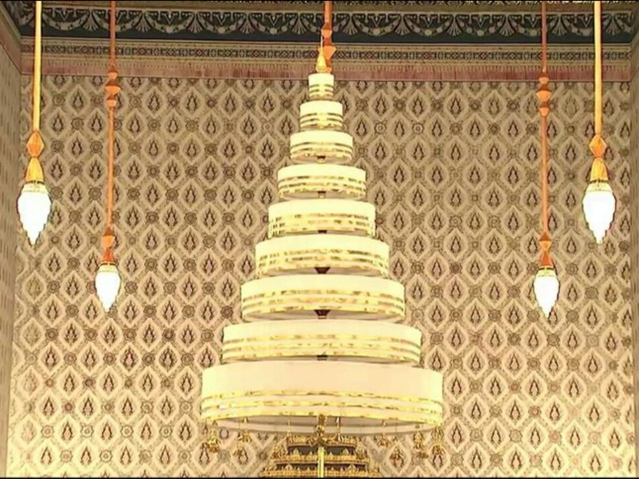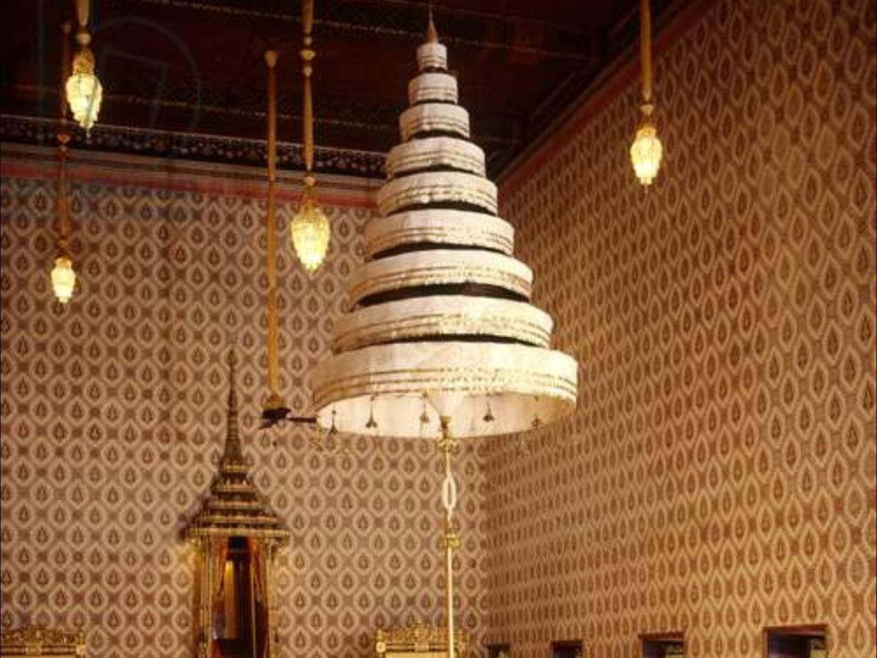 在加冕典礼上,国王陛下在阿提乌通蓬拉查阿萨纳王座大厅接受圣水时,王室婆罗门僧侣就会手持九层白伞敬献。