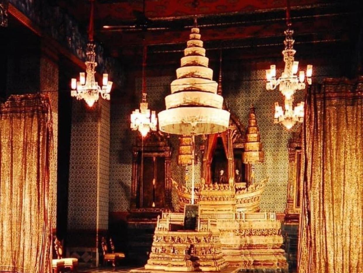 周围,镀金宝伞、五层宝伞和金银树环绕,安放在杜斯特玛哈普拉萨王座殿西廊,场面庄严肃穆。最后,国王敬献花圈、焚香烛,向舍利和诞辰佛像致敬,还为93位僧侣披袈裟、聆听经法、祈福送别,每一个环节都饱含着对太后的深情。