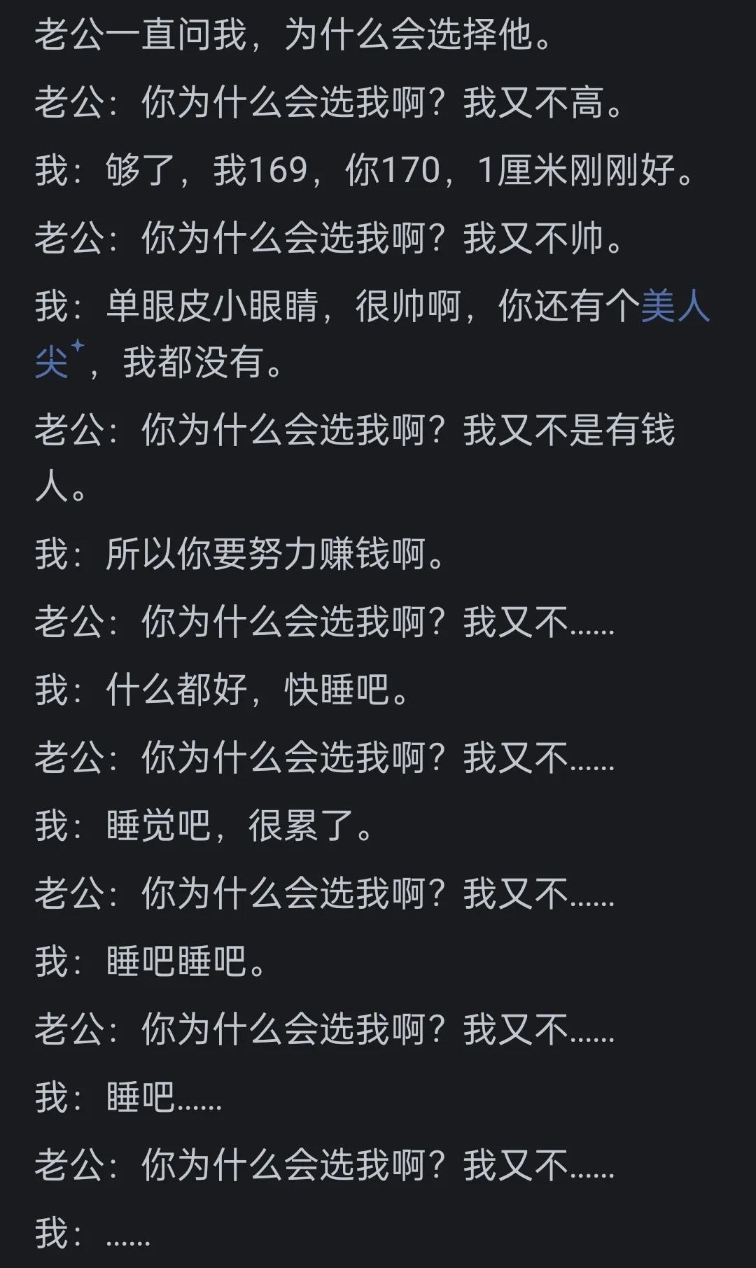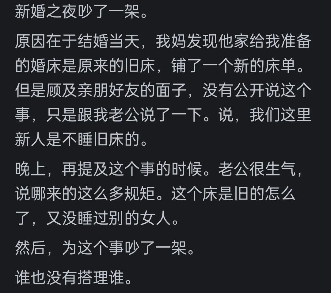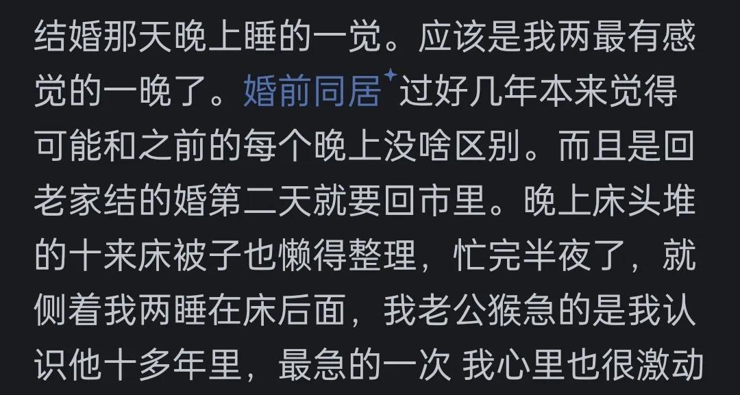 另一位网友则分享了她的闪婚经历:新婚夜因为和老公不熟悉,所以就各自睡了,他在床的一边,我在床的另一边,一直到婚后两个月才同房。哎,感觉这就是个大冤种,因为是闪婚,所以结婚后才慢慢熟悉起来。