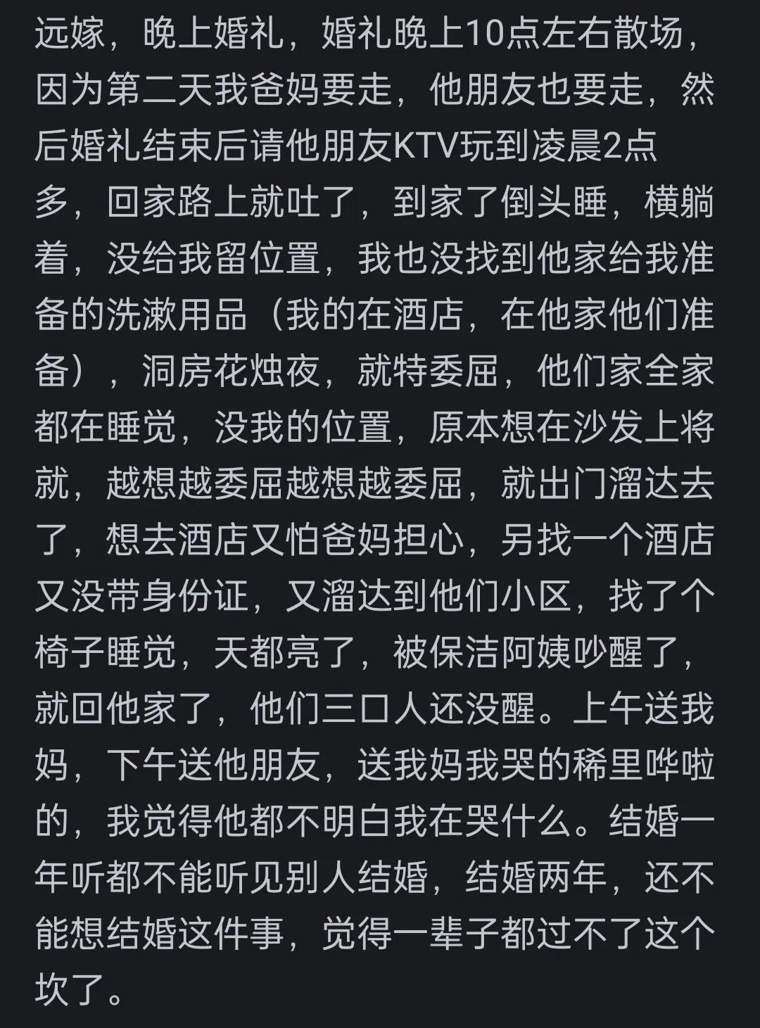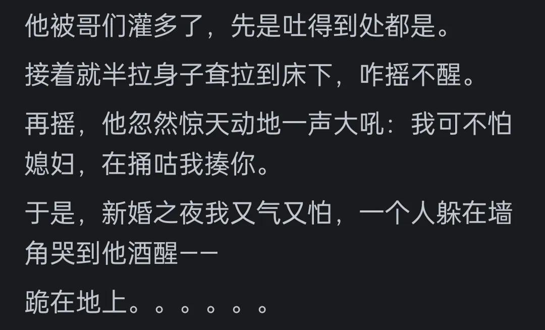 还有网友表示,男的喝多了大吵一架,男方母亲还一直在劝,最后男的喝多了呼呼大睡,自己难受的一夜没睡,真是让人无奈。