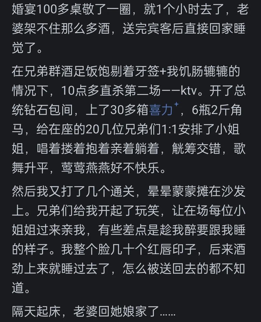 还有网友的分享则充满了喜剧色彩:先各回各妈家分赃数钱,然后去海底捞,自己的席没吃上,吃到了半夜回家亲嘴。结果,亲过敏了,肚子上起了个大包,真是让人哭笑不得。
