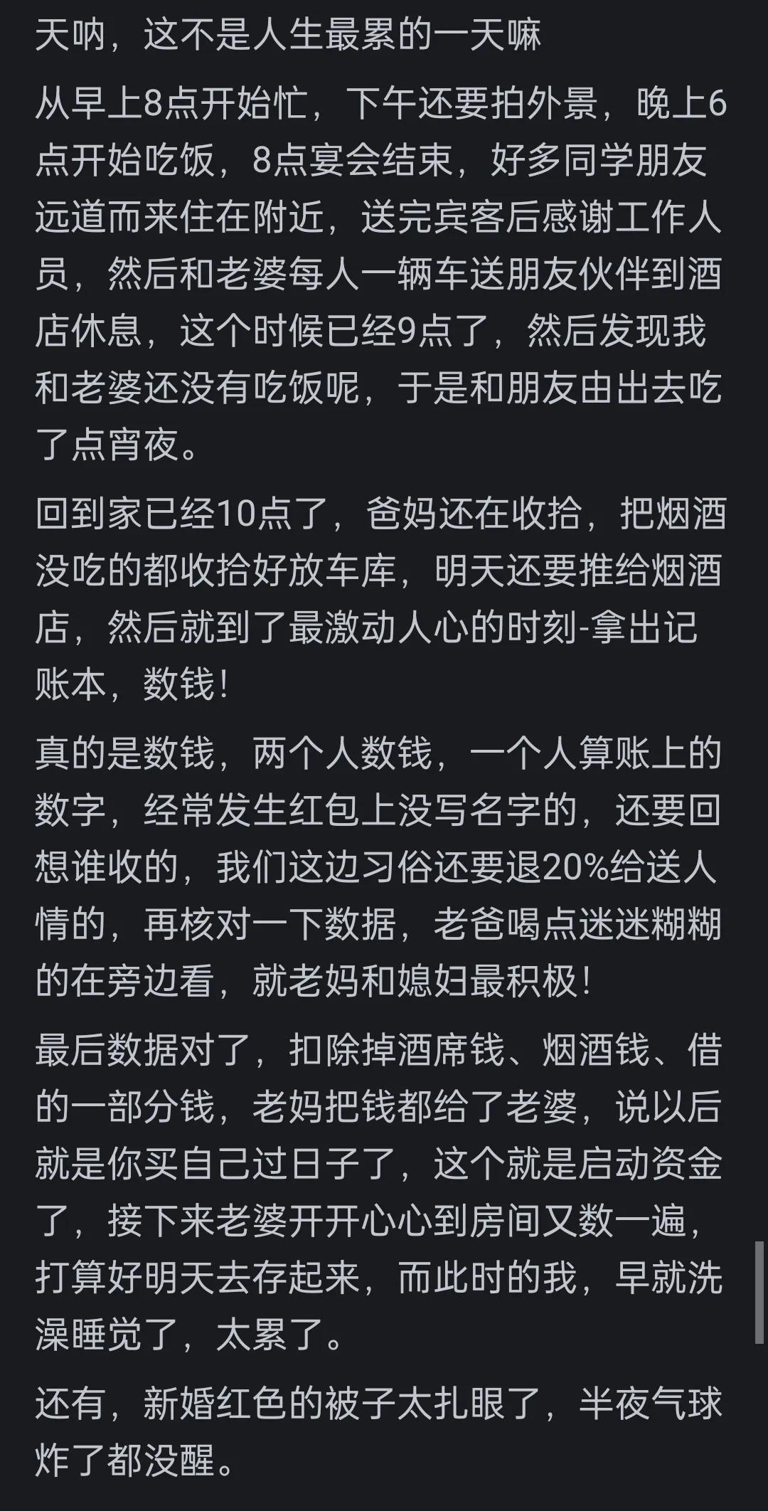 有网友表示,结婚真的好累啊!婚礼结束后,晚上随便洗洗,发几张照片在朋友圈就赶紧睡了,啥都不想做,终于结束了这一天的忙碌。