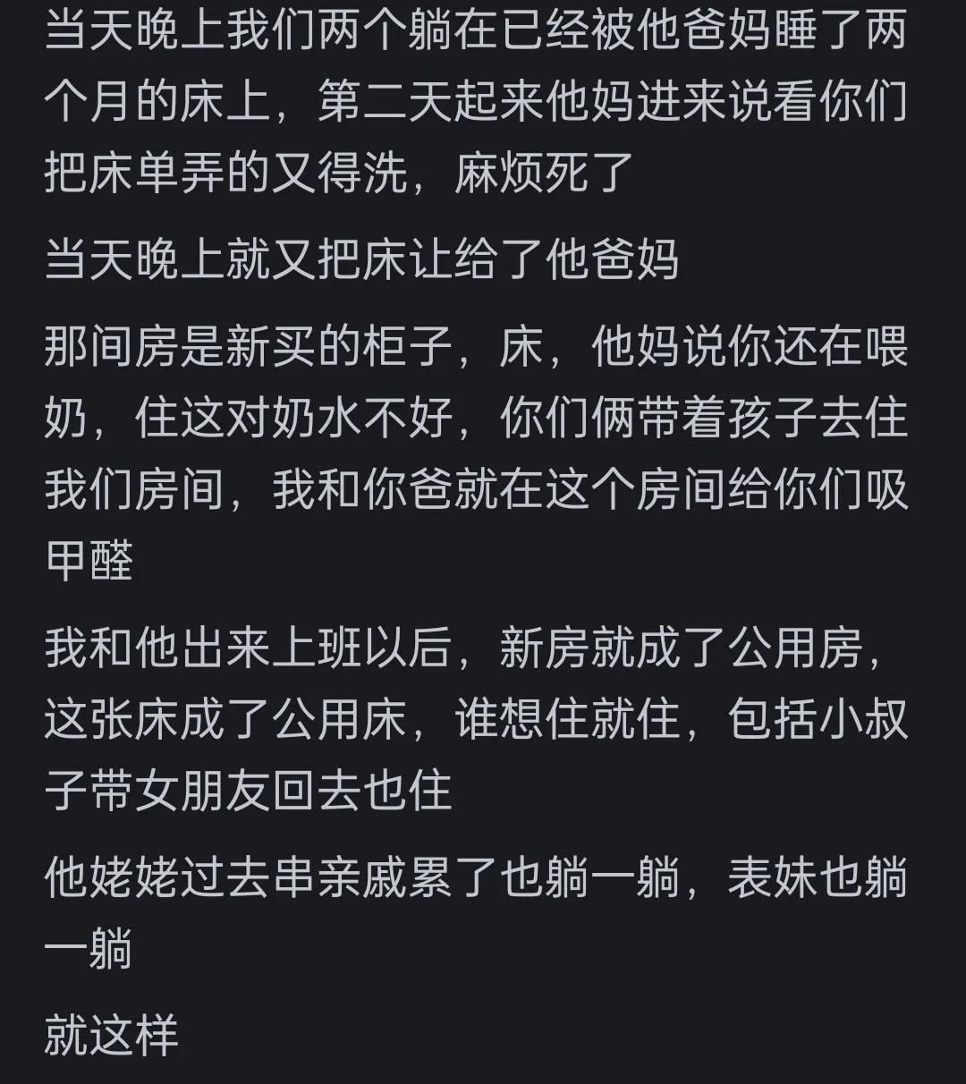 有网友则表示,自己跟男朋友的兴致全被他爸妈破坏了。赖在新房不走,晚上还直接睡在新房了,让他们都很生气,性致都没了。