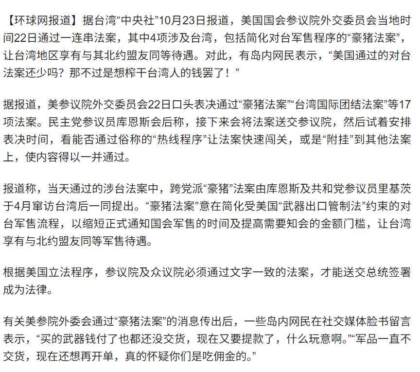 据美国国会相关报道,美国参议院外委会近日审议并通过了这项名为“豪猪法”的挺台法案。该法案的核心内容是将台湾纳入“北约伙伴行列”,并修改《武器出口管制法》,以简化美国对台湾当局的武器销售和认证程序。特别是针对现成库存武器和非对称作战装备,如导弹、无人机等快速部署系统,法案提供了更为便捷的获取途径。