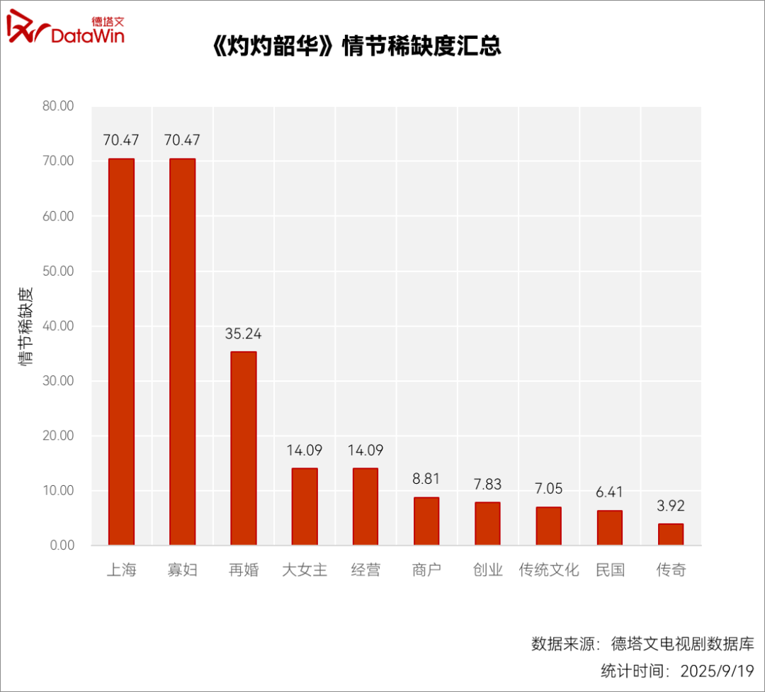 德塔文数据显示,“寡妇”“再婚”“经营”“创业”“大女主”等情节稀缺度数值较高,而这些高稀缺度的情节内容,在剧中都服务于塑造一个独立、复杂且极具挑战性的女主角形象。《灼灼韶华》以题材定位稀缺度为创作革新切入口,在传统年代剧题材创作上为行业输送了一股新风潮。
