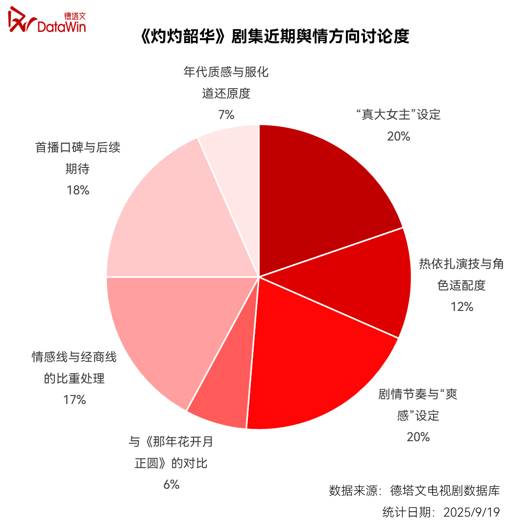 德塔文近期舆情方向讨论度显示,“剧情节奏与爽感设定”占比20%,位列各类舆情讨论方向热点的第一名。《灼灼韶华》的快节奏、强情节已然成为剧集当下最核心和招牌的卖点之一。