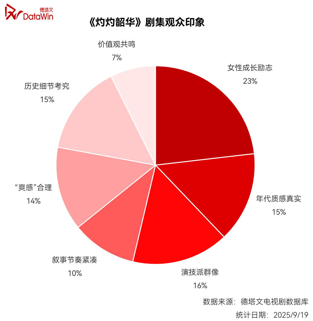 数据显示,“女性成长励志”是大众对于《灼灼韶华》最核心的印象词之一,同时“大女主”“女企业家”“搞事业”“野心家”等内容也是剧集关联度和提及率较高的舆情词汇。褚韶华独立、清醒、有野心的角色特质被市场观众有效感知,并引发高度关注与讨论。