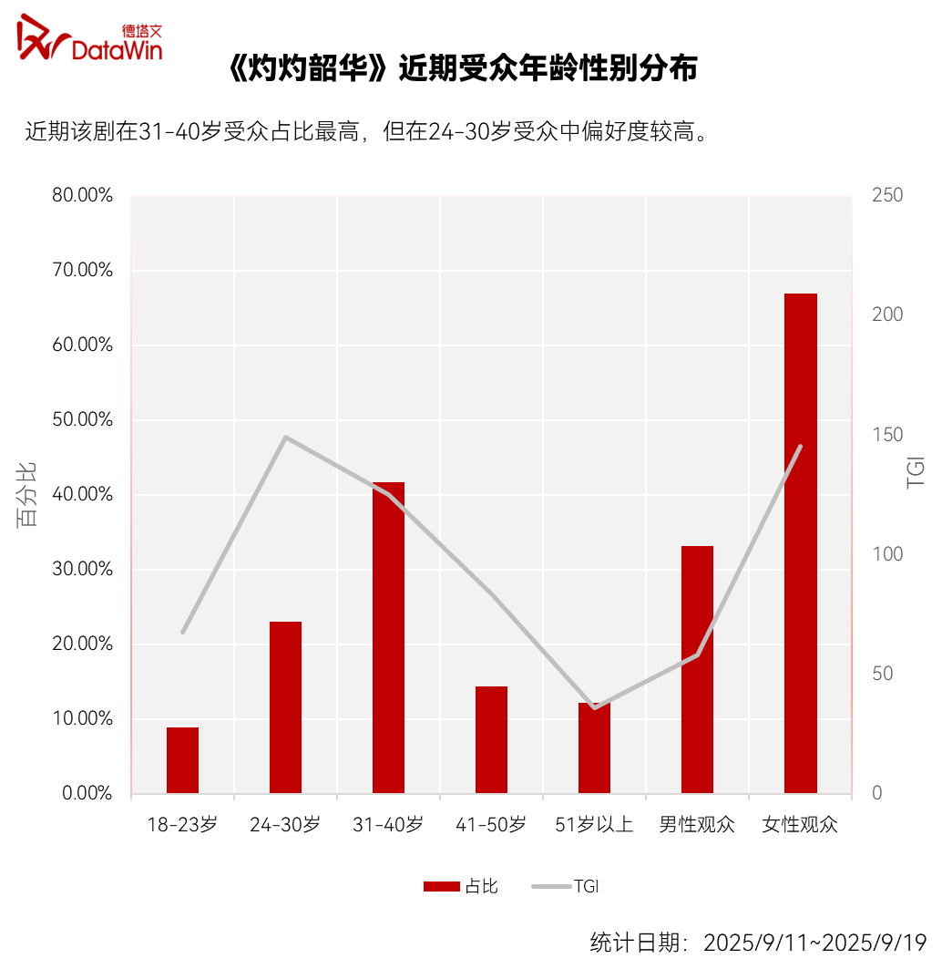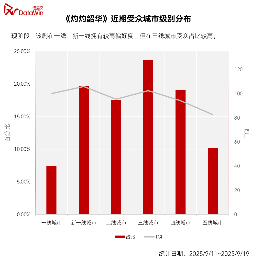 而在受众城市分布表现上,《灼灼韶华》在一线、新一线城市(TGI >100)及三线城市受众中,均呈现出较高的偏好度。这证明其剧情内容不仅有着可以被相对高知群体感知的审美格调与思想深度,也有着大众市场易理解、喜接纳的通俗特质与情感张力,具备内容的普世属性。《灼灼韶华》以有效创新探索打破了年代剧常有的“城市线级壁垒”,受众范围得以大幅拓展,成功实现剧集“路人盘”的有效拉动。