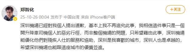 10月26日,郑智化在微博更新动态,表示深圳机场已就事件向他个人道歉,并承诺优化服务流程。他同时呼吁,希望以此次事件为契机,推动机场等公共场所完善对残障人士的协助措施。