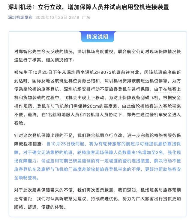 针对此次事件,深圳机场于10月25日晚发布通报称,已对郑智化反映的情况高度重视,并针对登机保障中的不足,联合航空公司立行立改,进一步完善轮椅旅客服务保障流程,包括优化升降设备操作规范、加强员工服务意识培训等。