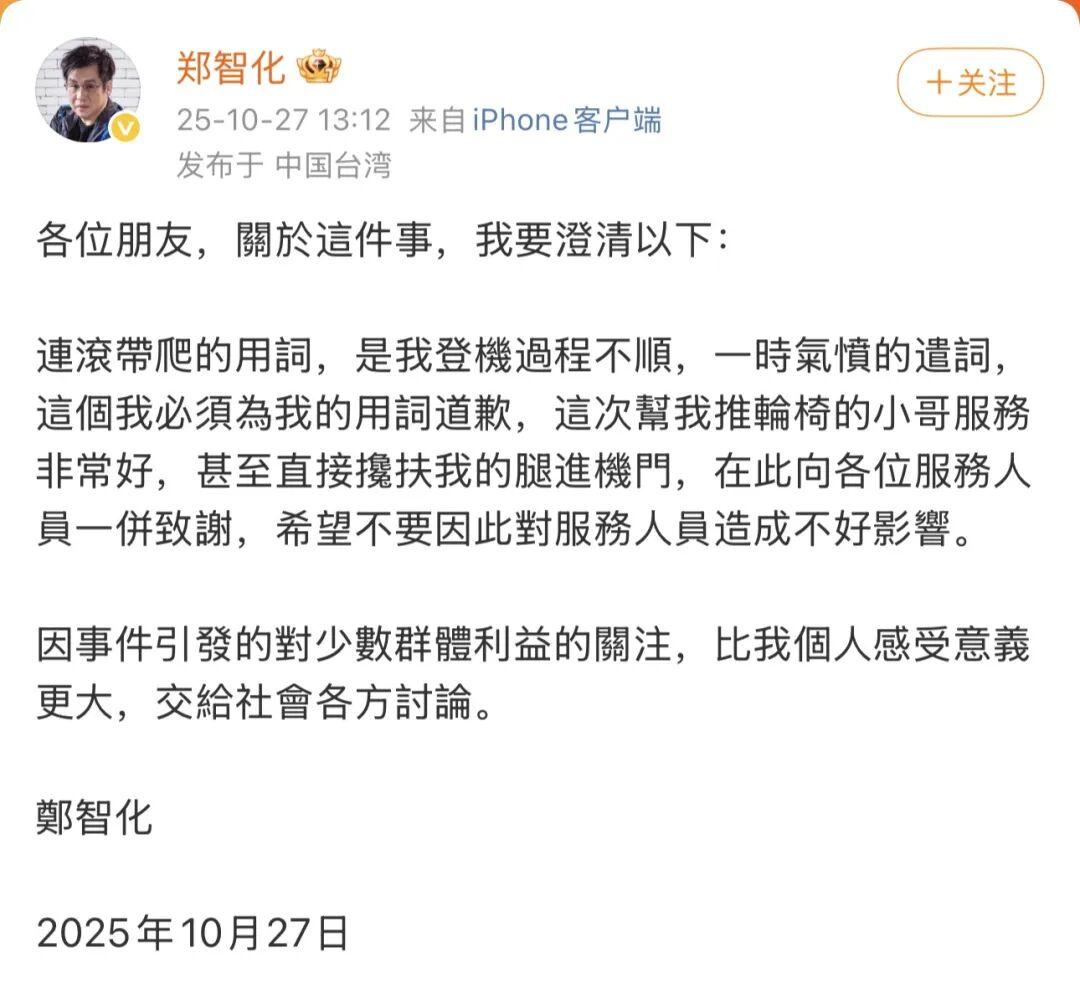 10月27日13时左右,台湾歌手郑智化在微博发文澄清“深圳机场登机事件”。他承认“连滚带爬”的用词源于登机过程不顺的情绪宣泄,并为此道歉。同时,他特别感谢机场服务人员,尤其是推轮椅的小哥“直接搀扶我的腿进机门”,呼吁公众勿因个人言论迁怒工作人员。