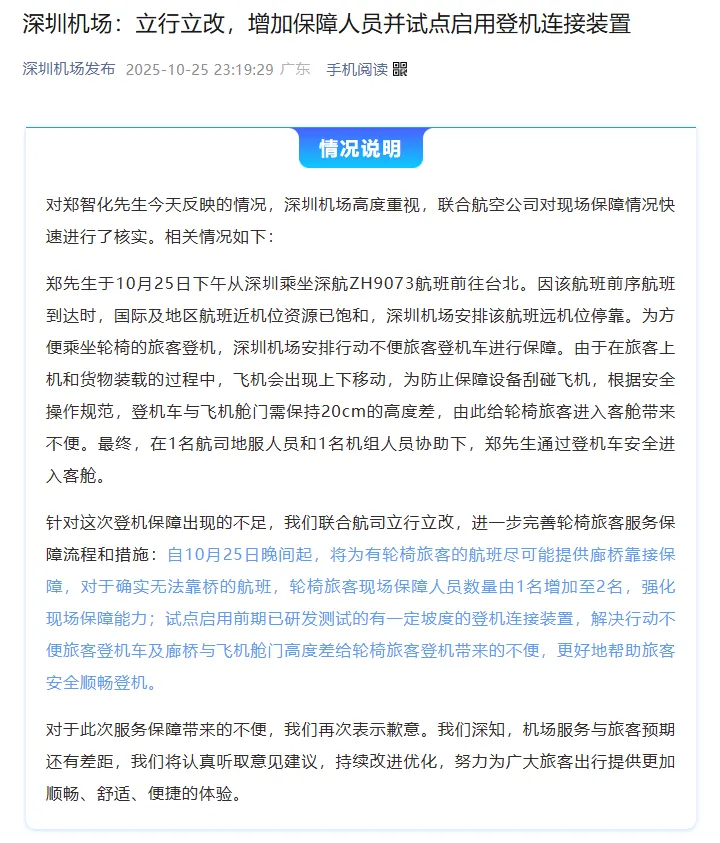 10月25日,郑智化发文批评深圳机场“无人性”,称远机位升降车与机门存在25公分落差,导致轮椅无法推进,且司机“冷眼看着我连滚带爬进飞机”。此文迅速引发全网声援,公众对机场无障碍服务的质疑达到顶峰。